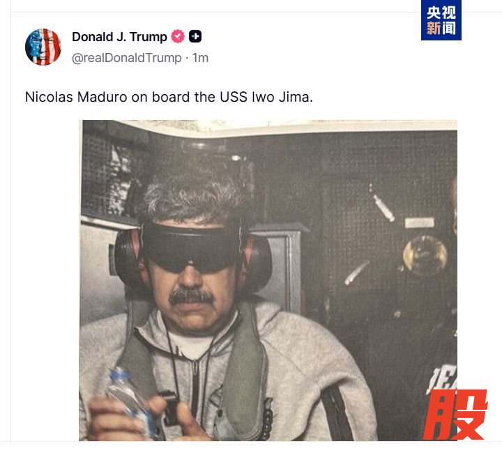 当地时间1月3日,特朗普在其社交平台“真实社交”(Truth Social)上发布了一张马杜罗在“硫磺岛”号军舰上的照片。照片中的马杜罗戴着手铐,双眼被黑布蒙住。