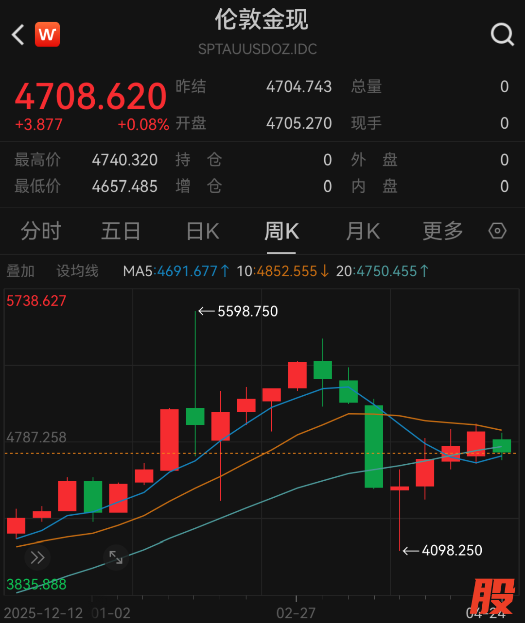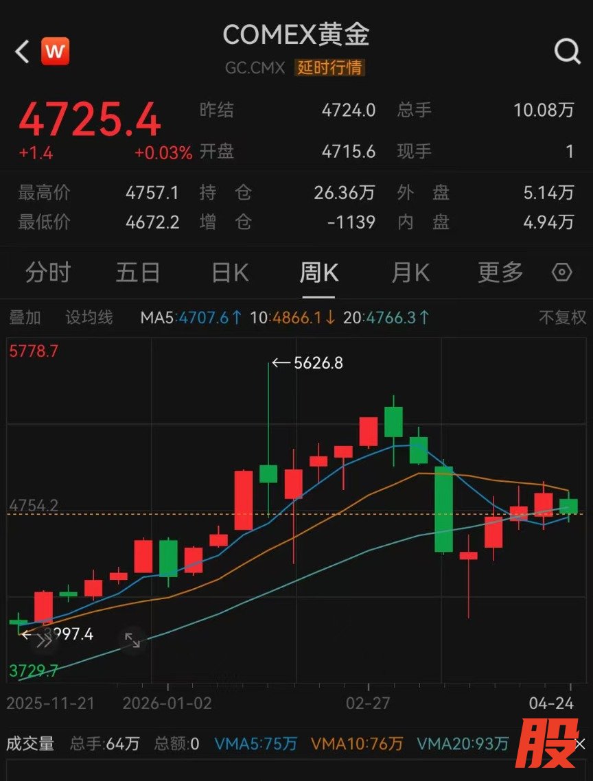 黄金价格方面,近期震荡下跌,COMEX黄金最新收报4725.4美元/盎司,伦敦金报4708.62美元/盎司,周跌幅分别为3.16%、2.66%,双双结束了四周连涨行情。