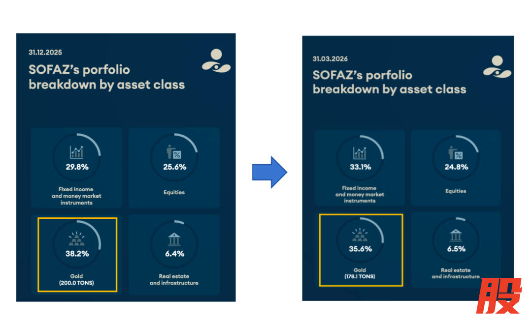 数据显示,截至2023年末,SOFAZ基金黄金持有占比为12%,在2024年大幅增持42.8吨黄金后,2024年末其黄金持有占比增至20.6%;2025年,该基金又增持了55.4吨黄金, 2025年末其黄金持有占比提升至38.2%。