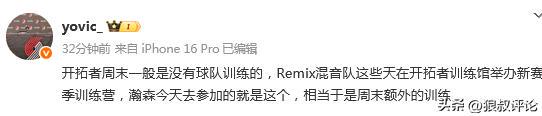 不久前趣投顾,开拓者中文记者“yovic”发文:开拓者周末一般是没有球队训练的,Remix混音队这些天在开拓者训练馆举办新赛季训练营,瀚森今天去参加的就是这个,相当于是周末额外的训练。